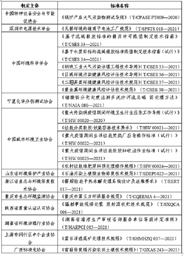 10月,全國團體標準信息平臺公布了21項生態(tài)保護和環(huán)境治理類團體標準,詳見下表。