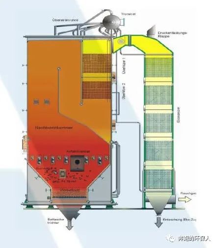 煙氣處理系統(tǒng):爐內(nèi)SNCR脫硝、靜電除塵器、布袋除塵器、濕式洗滌塔、再熱器(煙煙換熱)、煙囪排放(高度50m)
